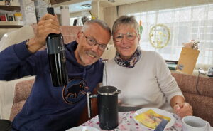 Mit unseren Womo-Nachbarn Andrea und Jürgen aus Deutschland verbringen wir hier eine schöne und lustige Zeit. Mit Kaffee und Kuchen wird heute der Geburtstag von Jürgen gefeiert!