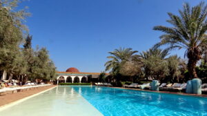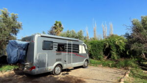 Heute steuern wir unseren Rufus auf der wunderbar ausgebauten 4-bahnigen Straße nach Marrakesch, wobei wir uns für einen etwa 15 km östlich gelegenen Campingplatz entscheiden. Das letzte Stück zuckeln wir auf einer holprigen, löchrigen Sandstraße zum